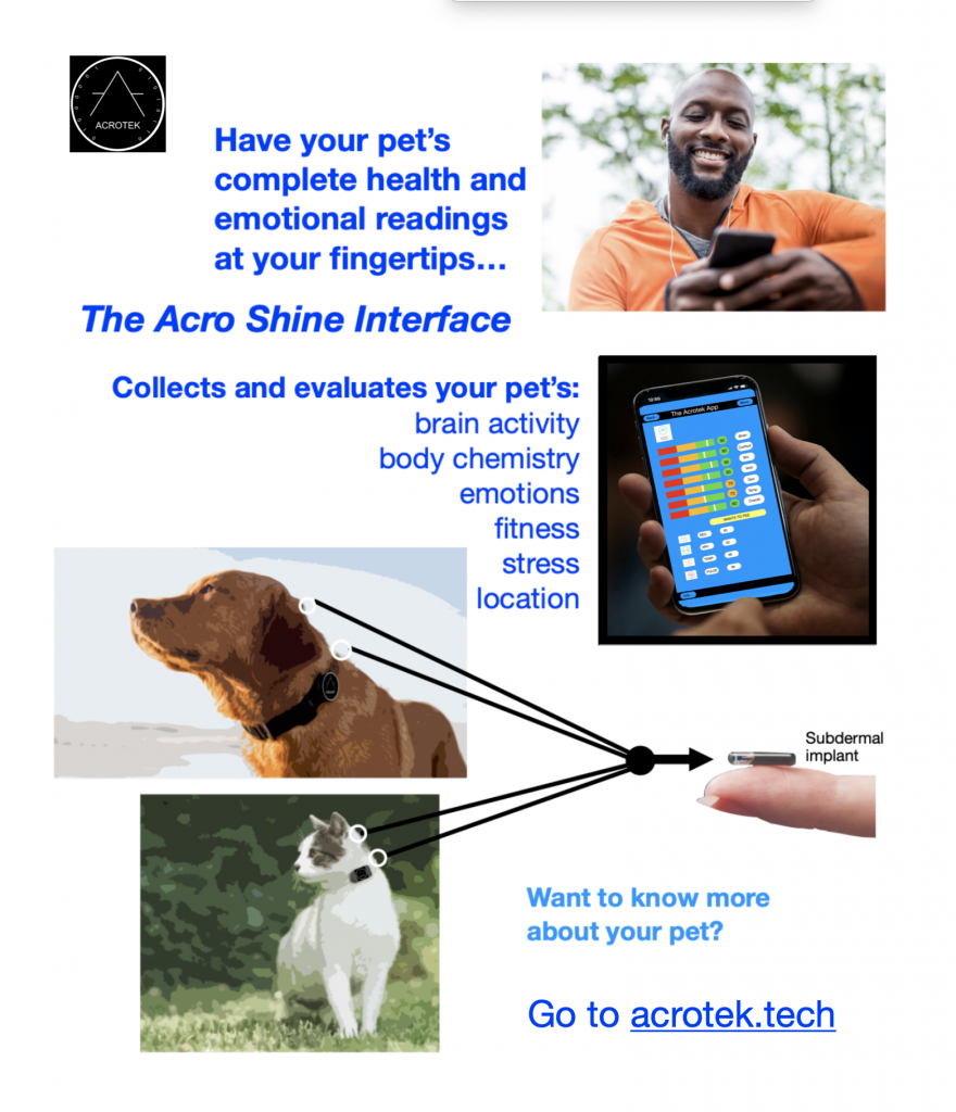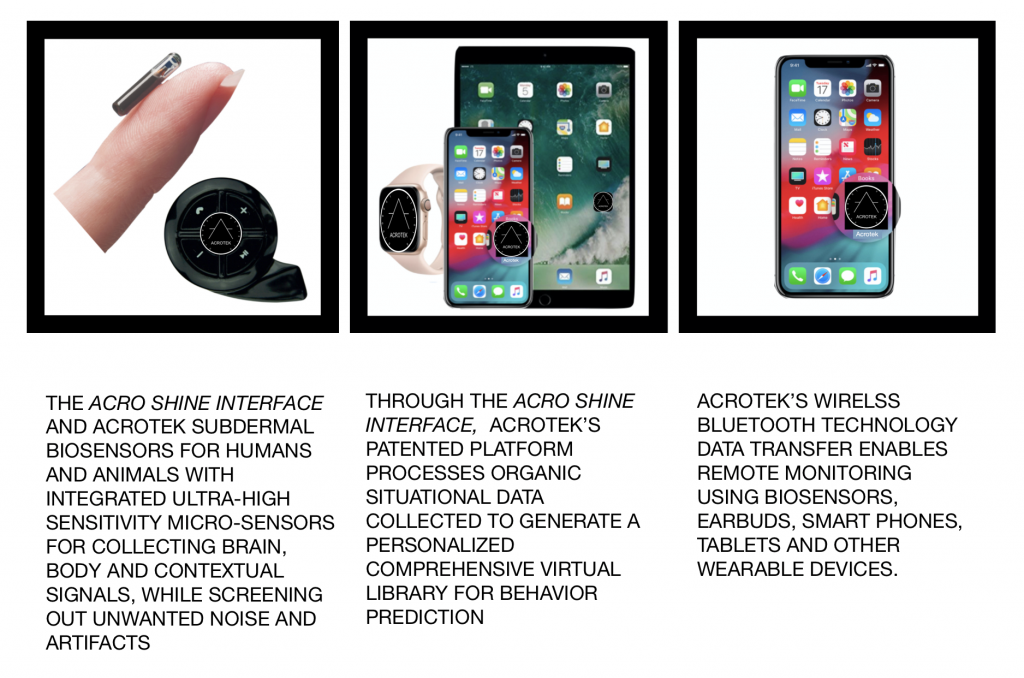 Acrotek is meeting existing and emergent needs of humans and animals with the Acro Shine Interface, a proprietary system comprised of sub-dermal implants, wearable devices and platform plug-in software that integrates neural and physiological responses to stimuli in real-world situations in any place.